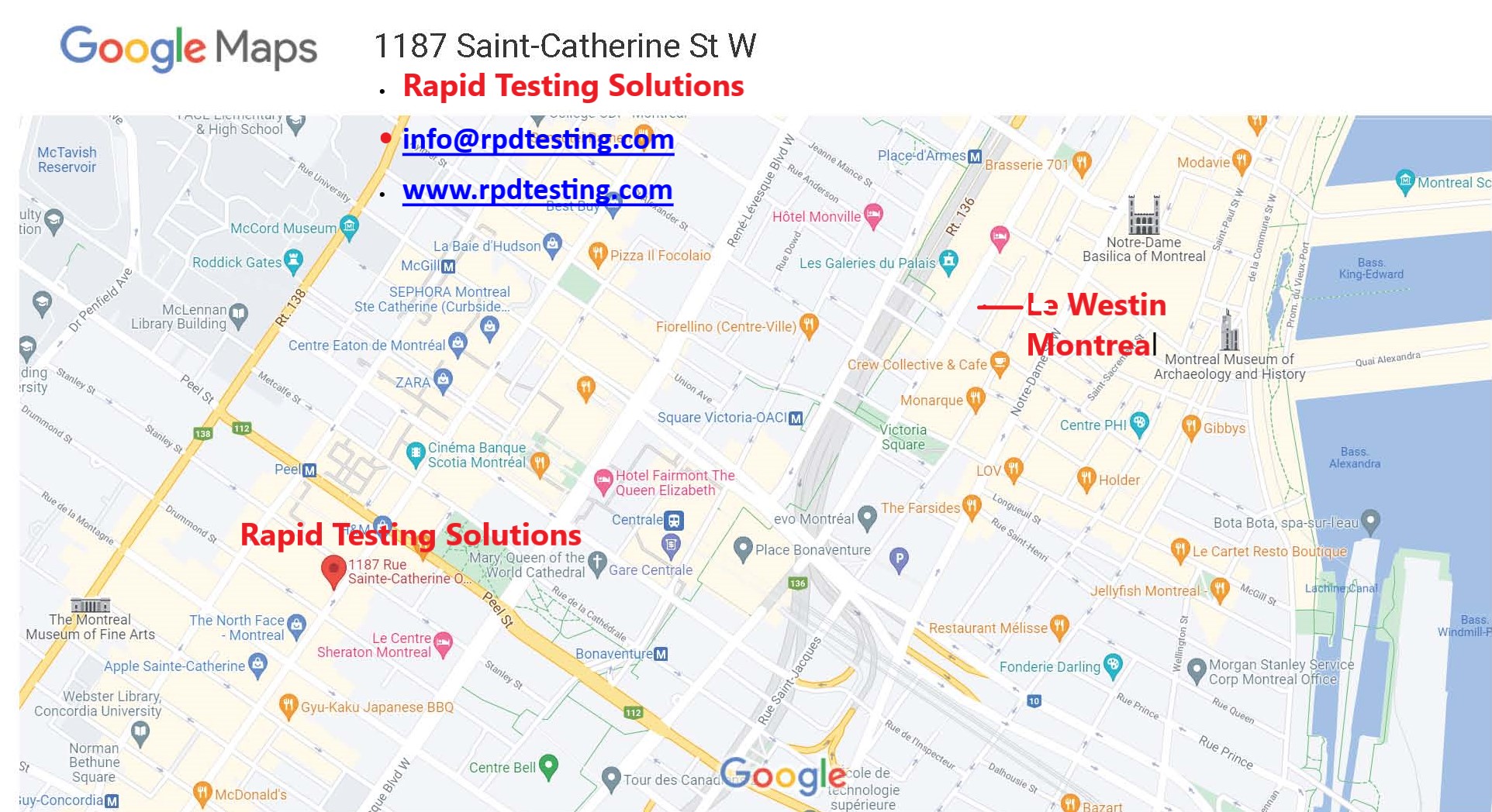 Testing for your return trip: - For those not flying with the US airlines, or who require a PCR test, there is a screening centre on Sainte-Catherine Street (downtown) and they seem to have the best prices ($95 for the antigen test and $199 for the PCR). Results provided in 24 hours for either test. The cost at the airport is significantly higher ($149 for the antigen and $249 for the PCR).